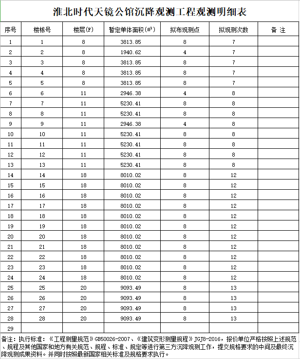3、工程委托日期:自委托日起至整個施工過程沉降及竣工驗收后一年內(nèi)(如滿足沉降規(guī)范范圍合格可停止觀測如不滿足規(guī)范需自行增加觀測直至沉降滿足規(guī)范標準后停止,費用包含在總價內(nèi))為沉降觀測期?!?br /> 4、沉降觀測任務(內(nèi)容)與執(zhí)行技術(shù)標準: