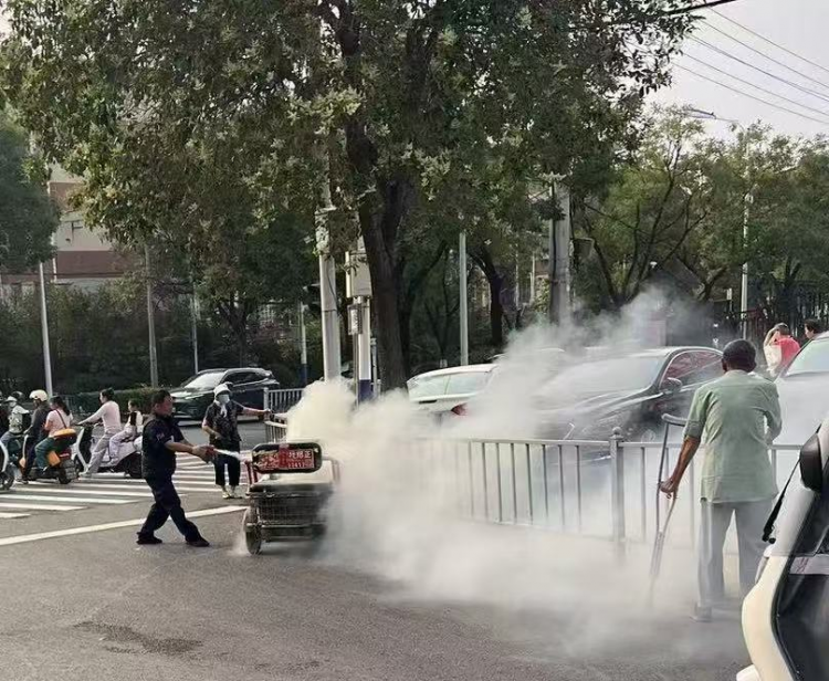 2025年6月11日上午7時41分許,淮北市保安有限公司武裝押運一中隊W699Y車組行駛至建設(shè)銀行西城支行網(wǎng)點路口時,突遇一輛三輪電動車自燃,火苗從車底迅猛竄出,騎車?yán)先梭@慌失措,周邊群眾紛紛后退。時值早高峰,車流人流密集,如不及時處置,后果不堪設(shè)想。