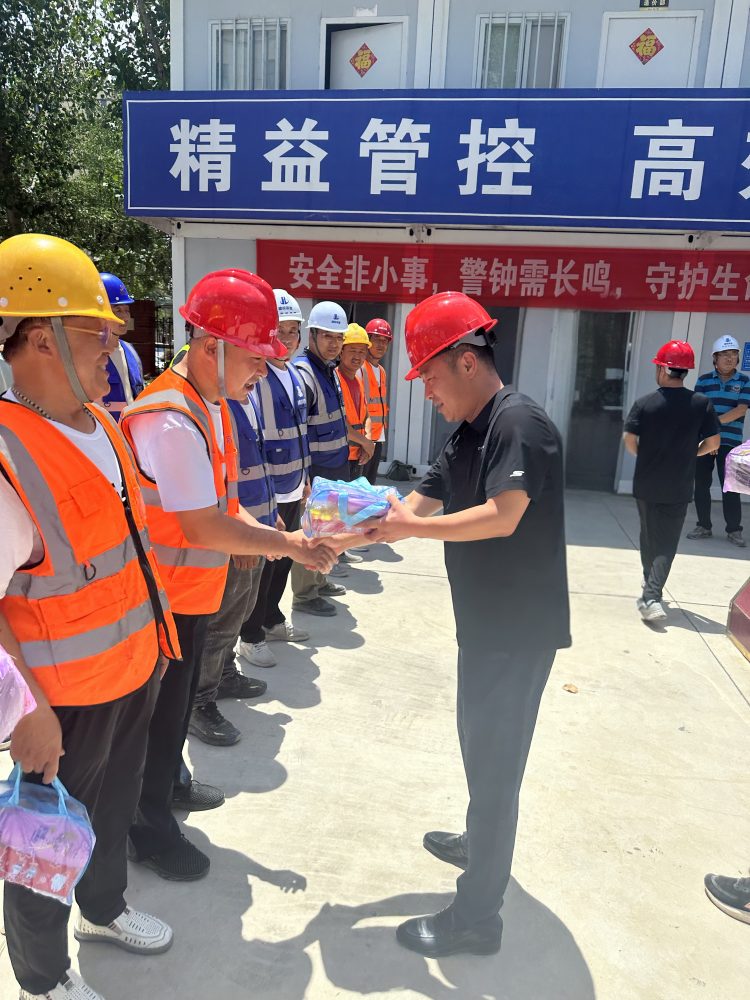 在項目現場,趙焱將防暑降溫物資送到一線施工人員手中,對他們在高溫環(huán)境下堅守崗位、辛勤付出表示感謝,同時叮囑大家要注意防暑降溫,確保自身安全與健康。