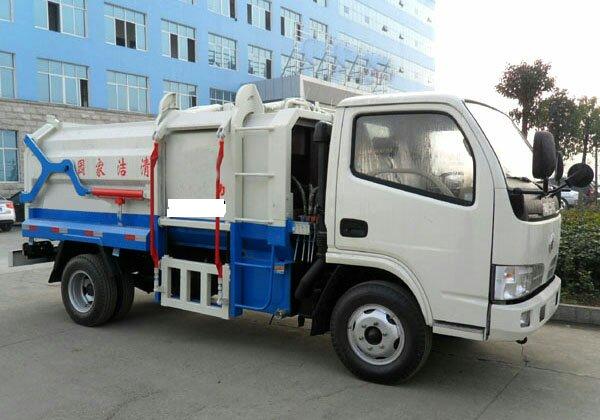 b.車上配置:有效裝載容積5立方,箱體采用邊三底四碳鋼板制作,箱體前部側(cè)面帶有掛桶提升機構(gòu),可自動舉升垃圾桶倒入垃圾,帶自卸功能,尾部裝有橡膠密封條,防污水滴漏。